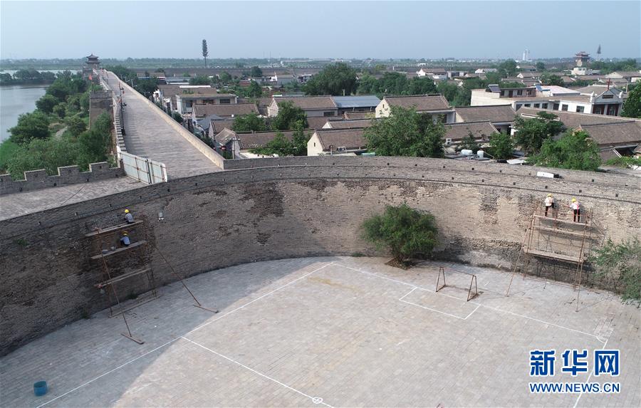 7月2日,工作人員在永年廣府古城修繕城墻(無人機照片)。經國家文物局和河北省文物局批準,河北永年廣府古城修繕工程已全面啟動。在文物專家全程參與下,按照“不改變文物原狀”原則進行修繕,預計2021年4月底完工。永年廣府古城擁有華北地區(qū)保存最完整的古城墻,現(xiàn)為全國重點文物保護單位。新華社記者王曉攝