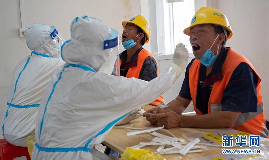 7月2日,在北京市大興區(qū)中建三局二公司北京公司一項(xiàng)目建筑工地的臨時(shí)核酸檢測(cè)采樣點(diǎn),醫(yī)護(hù)人員為建筑工地人員采集咽拭子。新華社記者才揚(yáng)攝