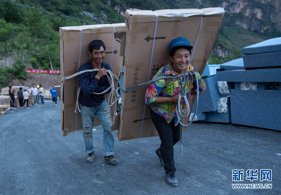 且沙次干、阿達么日雜夫婦倆背著政府贈送的四件套準備放進新居(6月29日攝)。新華社記者 江宏景 攝