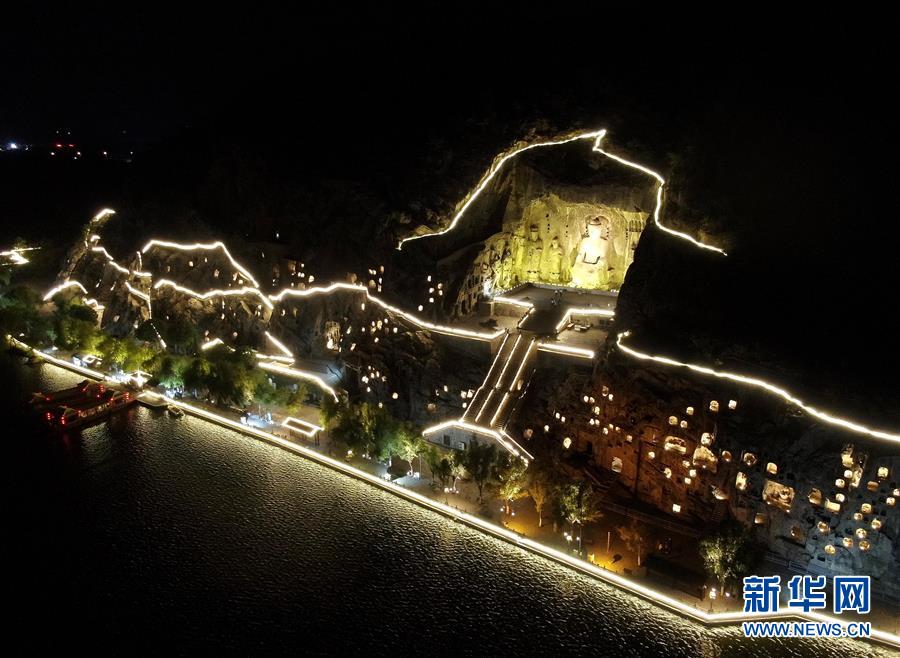 這是6月8日拍攝的洛陽(yáng)龍門(mén)石窟景區(qū)夜景(無(wú)人機(jī)照片)。新華社記者 李安 攝