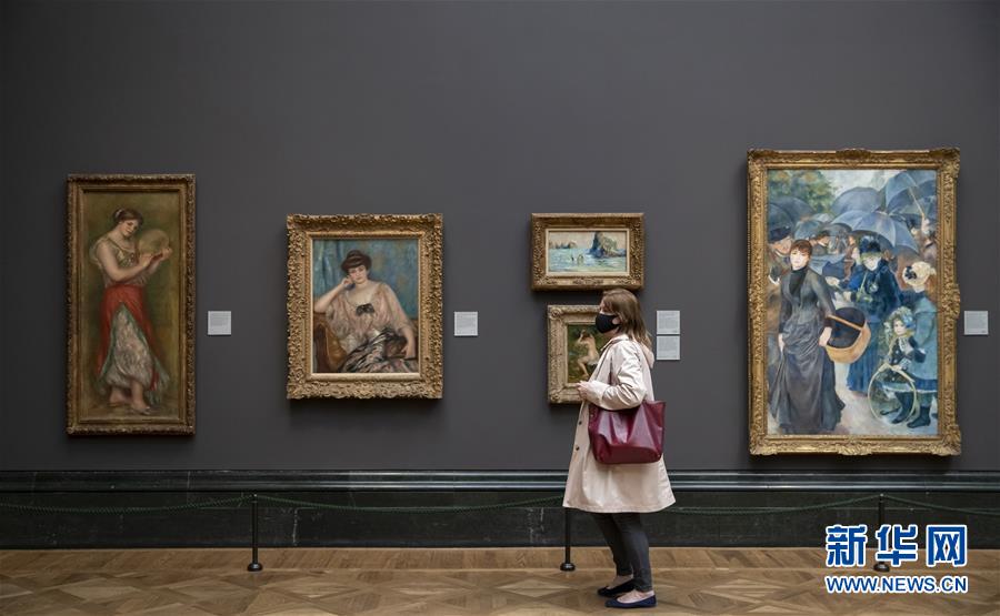 7月4日,參觀者佩戴口罩在英國國家美術(shù)館的媒體開放日上參觀。受新冠疫情影響而關(guān)閉的英國國家美術(shù)館將于7月8日重新對公眾開放,成為倫敦首批開門迎客的博物館、美術(shù)館。參觀者需提前網(wǎng)上預(yù)約參觀時段,全程佩戴口罩且保持安全距離。新華社記者韓巖攝