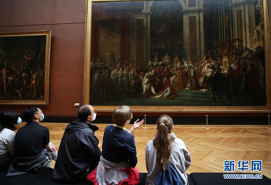 7月6日,參觀者在法國巴黎盧浮宮博物館欣賞畫作《拿破侖加冕》。因新冠病毒疫情關(guān)閉3個多月后,法國盧浮宮博物館于6日重新開放。新華社記者高靜攝
