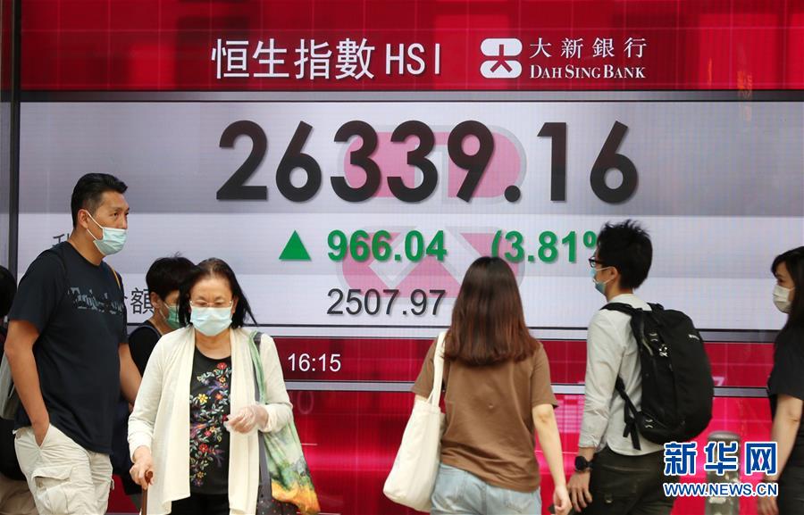 7月6日,人們從位于香港中環(huán)的股市信息屏前經(jīng)過。香港恒生指數(shù)6日漲966.04點(diǎn),漲幅3.81%,收?qǐng)?bào)26339.16點(diǎn)。全日主板成交2507.97億港元。新華社記者李鋼攝