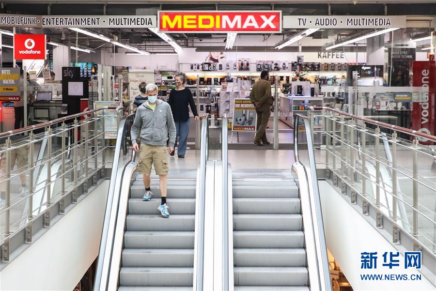 7月7日,佩戴口罩的顧客在德國首都柏林一家購物中心購物。針對有地方官員呼吁取消民眾乘坐公交車和在商場購物時(shí)須戴口罩的規(guī)定,德國聯(lián)邦政府6日表示,支持延續(xù)“口罩強(qiáng)制令”。4月底,德國全部16個(gè)聯(lián)邦州陸續(xù)出臺“口罩強(qiáng)制令”,即居民在乘坐公交車和購物時(shí)須佩戴口罩。新華社記者單宇琦攝