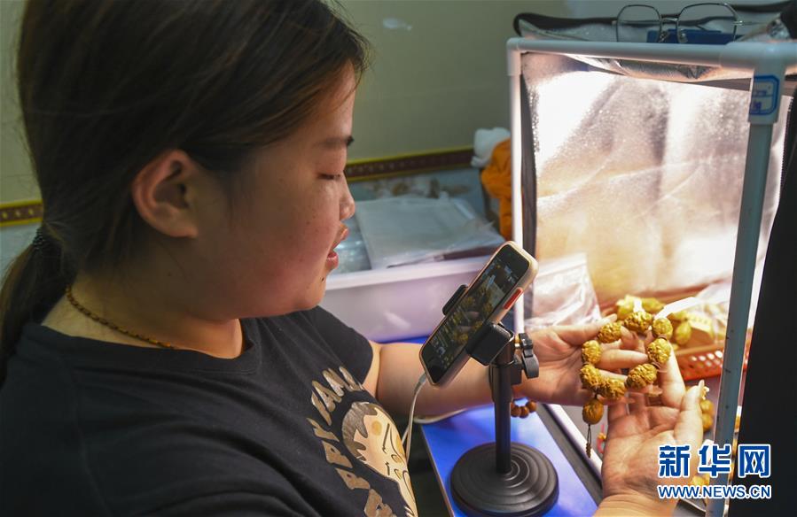 7月7日,河北省永清縣別古莊鎮(zhèn)核雕企業(yè)網(wǎng)絡(luò)主播在網(wǎng)上直播銷售雕刻作品。河北省永清縣有核雕企業(yè)1500余家,相關(guān)從業(yè)人員4萬余人。今年以來,該縣克服疫情影響,廣泛利用電商平臺進(jìn)行網(wǎng)絡(luò)直播銷售,網(wǎng)上銷售額已占總銷售額的90%以上,有效緩解了線下銷售壓力,為當(dāng)?shù)貛砹己玫慕?jīng)濟(jì)效益。新華社記者李曉果攝
