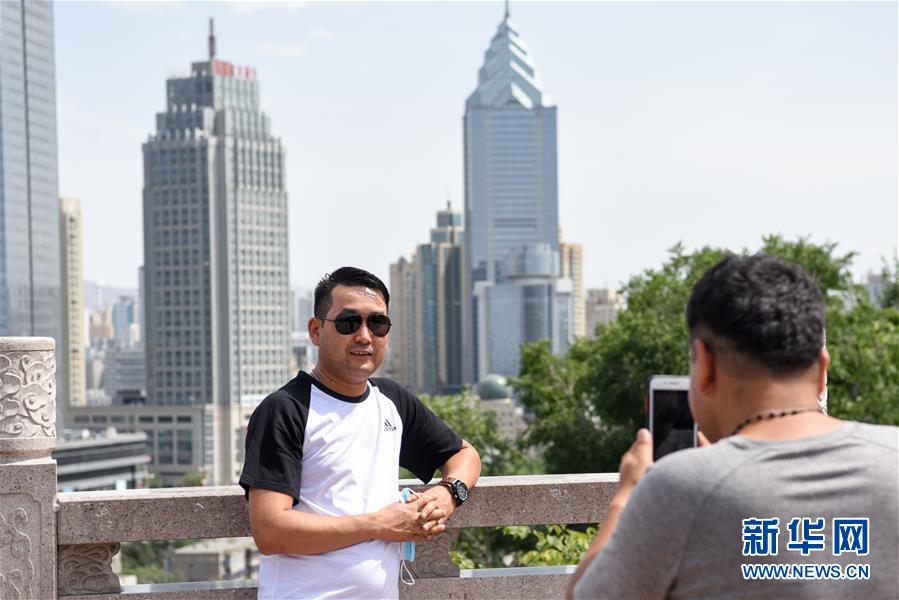 游客在烏魯木齊紅山公園拍照留念(7月5日攝)。新華社記者丁磊攝