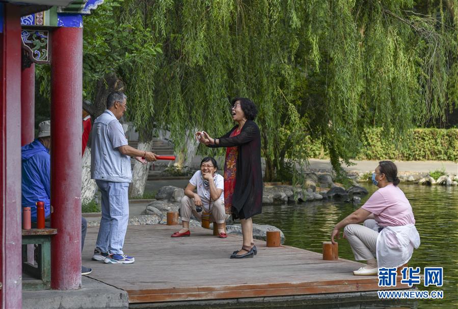 在烏魯木齊人民公園的一處角落里,戲迷們?cè)诰毘?月5日攝)。新華社記者趙戈攝