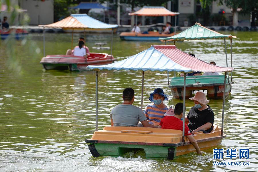 在烏魯木齊人民公園,市民在湖面劃船游玩(7月5日攝)。新華社記者趙戈攝