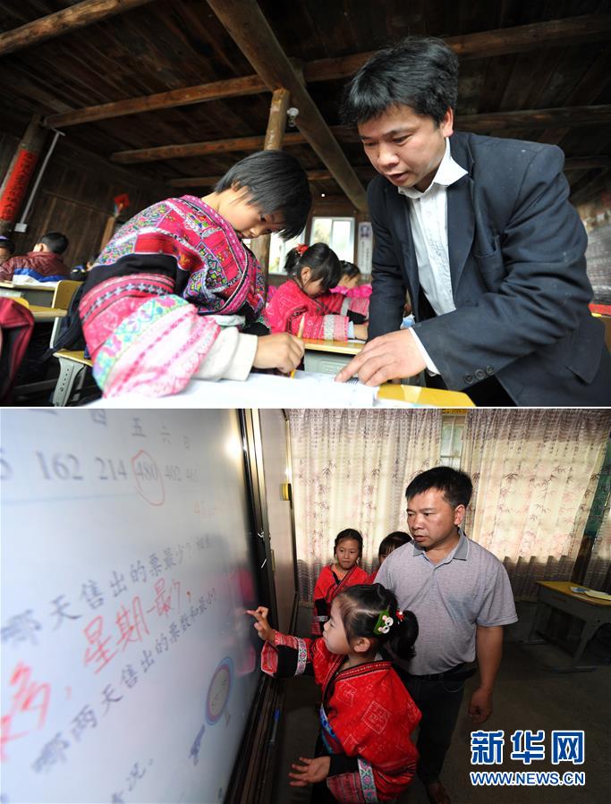 這是一張拼版照片,上圖:在廣西龍勝龍脊鎮(zhèn)江柳村翁江小學,余啟貴老師在課間輔導(dǎo)學生功課(2013年2月26日攝);下圖:在廣西龍勝龍脊鎮(zhèn)江柳村翁江小學,余啟貴老師在課間輔導(dǎo)學生功課(7月7日攝)。新華社記者陸波岸攝