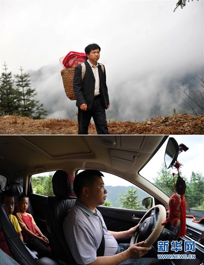 這是一張拼版照片,上圖:在廣西龍勝龍脊鎮(zhèn)江柳村,余啟貴老師背著背簍領(lǐng)著學生去學校(2013年2月26日攝);下圖:在廣西龍勝龍脊鎮(zhèn)江柳村,余啟貴老師開著自己的汽車帶著學生去學校(7月7日攝)。新華社記者陸波岸攝