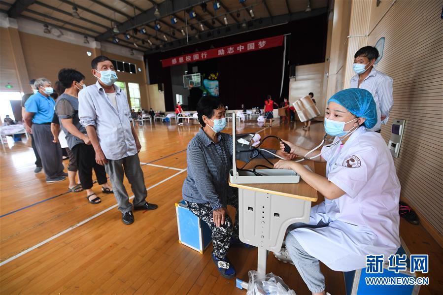 7月8日,在杭州市富陽區(qū)東洲街道安置點東洲中心小學(xué),醫(yī)護人員在給村民測量血壓。新華社記者徐昱攝