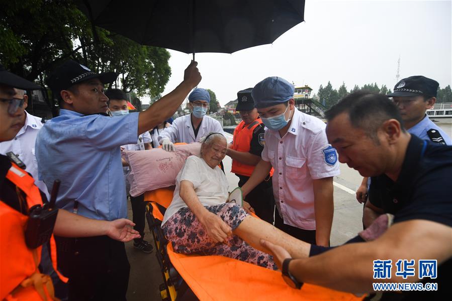 7月8日,應(yīng)急人員將東洲街道五豐島97歲癱瘓在床的董老太太撤離出來,安全轉(zhuǎn)移到岸上。新華社記者徐昱攝