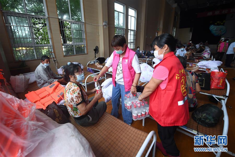 7月8日,在杭州市富陽區(qū)東洲街道安置點東洲中心小學(xué),志愿者向村民發(fā)礦泉水等物資。新華社記者徐昱攝