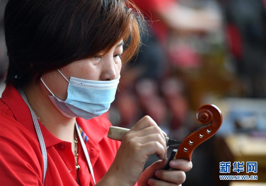 工人在河南駐馬店市確山縣提琴產(chǎn)業(yè)園提琴生產(chǎn)車(chē)間雕刻琴頭(7月3日攝)。新華社記者李嘉南攝