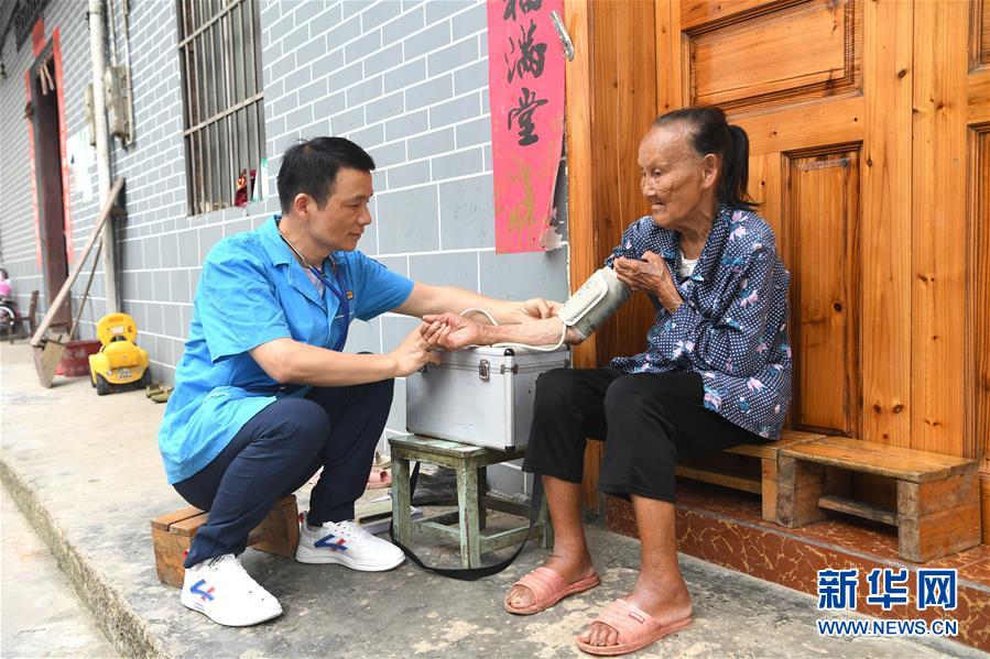7月8日,在長垌村出診的陶雷(左)給一名瑤族群眾測量血壓。新華社記者周華攝