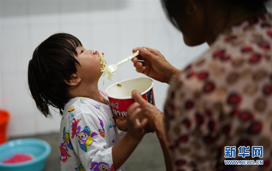 7月9日,村民在給小朋友喂飯。當日,江西鄱陽縣鄱陽鎮(zhèn)因洪水受災(zāi)的村民被轉(zhuǎn)移到多個集中安置點。在鄱陽縣五一中心學校安置點,志愿者和工作人員接到任務(wù)后不到十小時內(nèi),為被轉(zhuǎn)移村民布置了28間教室,供519人安頓,并為村民發(fā)放褥子、床單、枕頭、盒飯、飲用水等物資。新華社記者周密攝