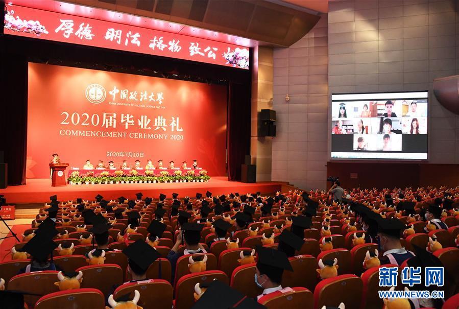 7月10日拍攝的中國政法大學(xué)2020屆畢業(yè)典禮現(xiàn)場。當日,中國政法大學(xué)舉行2020屆畢業(yè)典禮。由于疫情防控需要,僅少量在校畢業(yè)生在中國政法大學(xué)昌平校區(qū)禮堂現(xiàn)場參加畢業(yè)典禮,更多畢業(yè)生通過線上直播參與。新華社記者任超攝