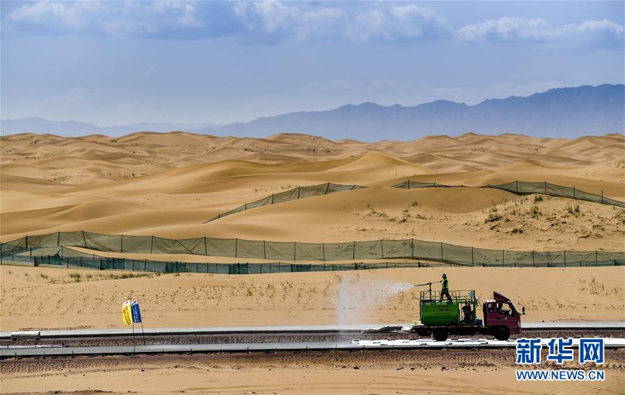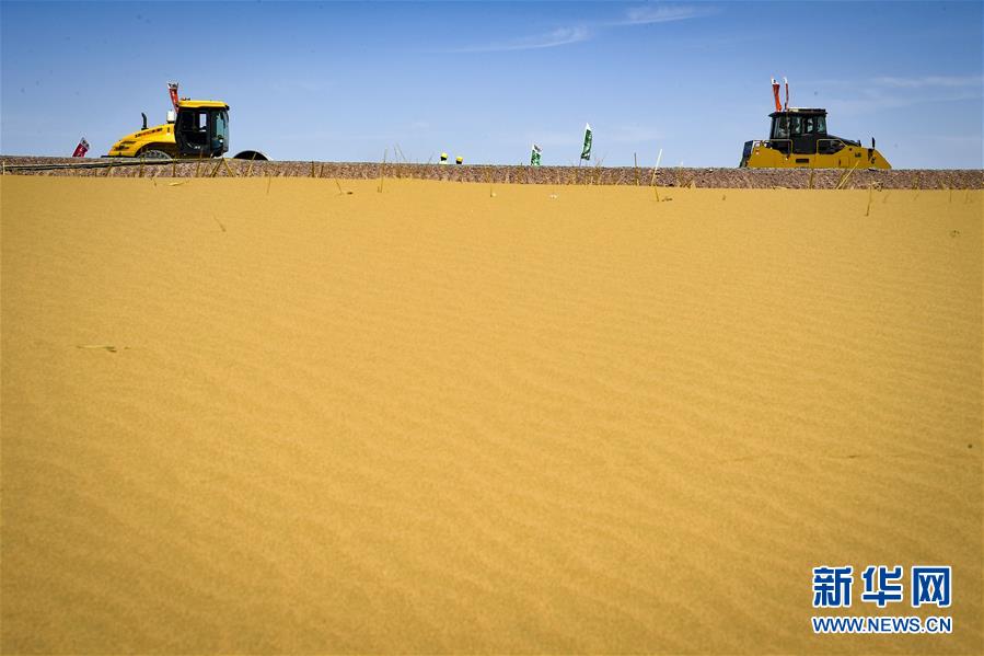 7月10日,工人在位于寧夏境內(nèi)的烏瑪高速青銅峽至中衛(wèi)段A10標(biāo)段施工。盛夏時(shí)節(jié),位于寧夏境內(nèi)的烏瑪(內(nèi)蒙古烏海市至青?,斍呖h)高速青銅峽至中衛(wèi)段正在抓緊施工建設(shè)。該路段主線全長(zhǎng)122.9公里,其中穿越騰格里沙漠腹地的18公里公路是寧夏建設(shè)的首條沙漠高速公路,預(yù)計(jì)2021年建成通車。新華社記者馮開華攝。