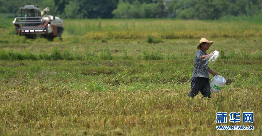 7月11日,村民在湖南省衡陽市衡陽縣臺源鎮(zhèn)臺九村收割后的稻田施肥,為種植晚稻做準備。近日,湖南各地農(nóng)村陸續(xù)進入“雙搶”季,農(nóng)民緊抓農(nóng)時,搶收搶種,力爭糧食穩(wěn)產(chǎn)豐收。新華社記者趙眾志攝