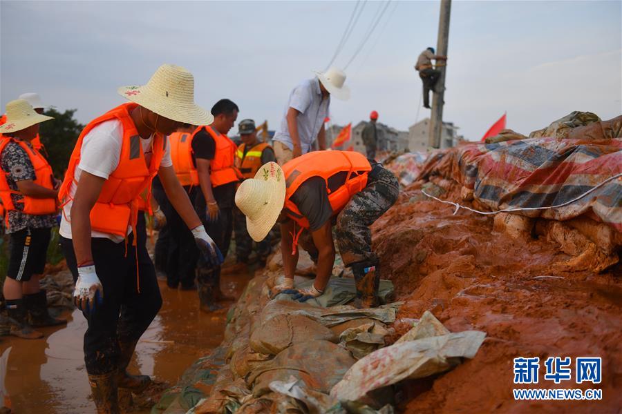 在江西鄱陽縣昌江圩,武警江西總隊機動支隊的工作人員和當?shù)卮迕褚黄鸺庸疼椎蹋?月12日攝)。新華社記者 胡晨歡 攝