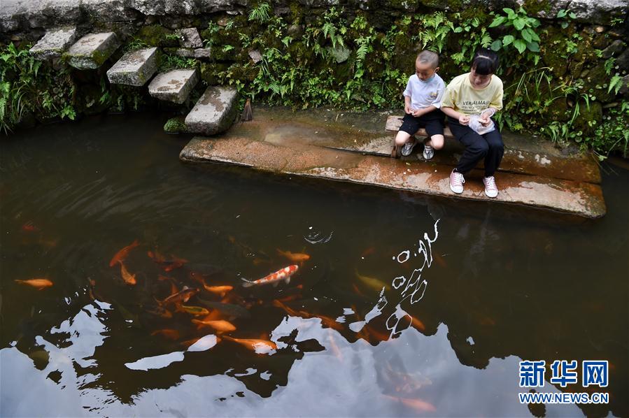 7月3日,小朋友在浦源村鯉魚溪畔喂食溪中的鯉魚。新華社記者 姜克紅 攝