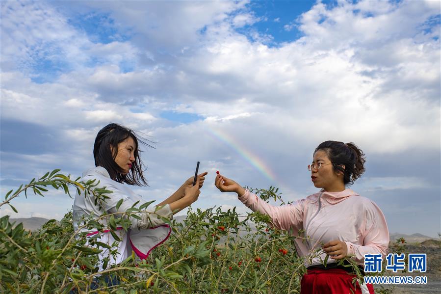 在新疆精河縣城近郊的一處枸杞園,朱虹美(右)和助手李紅英在拍攝視頻,向網(wǎng)友介紹待采收的枸杞(7月11日攝)。新華社記者 胡虎虎 攝