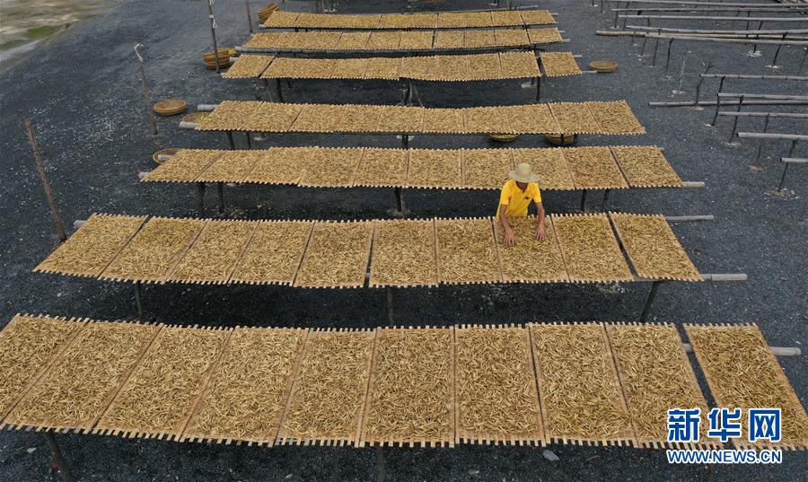 7月12日,祁東縣黃土鋪鎮(zhèn)雁隆食品公司內(nèi),工人在晾曬黃花菜(無人機(jī)照片)。新華社記者 趙眾志 攝