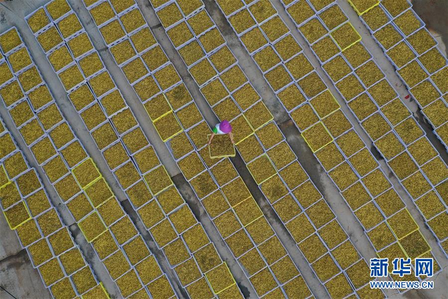 7月12日,祁東縣黃土鋪鎮(zhèn)雁隆食品公司內(nèi),工人在晾曬黃花菜(無人機(jī)照片)。新華社記者 趙眾志 攝