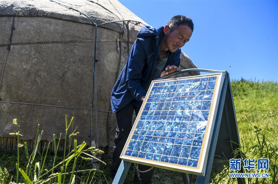 在新疆伊犁特克斯縣境內(nèi)的夏牧場(chǎng)里,一位牧民在氈房外調(diào)整太陽(yáng)能板的擺放位置(7月2日攝)。新華社記者 王菲 攝