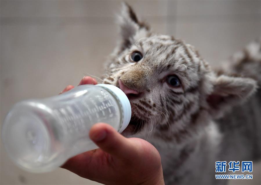 7月13日,動(dòng)物園工作人員許家興給“妞妞”喂水。河北石家莊市動(dòng)物園的孟加拉白虎寶寶“妞妞”只有3個(gè)月大,由于虎媽媽經(jīng)驗(yàn)不足,“妞妞”一出生便由動(dòng)物園工作人員按科學(xué)方法人工飼養(yǎng)。目前,在飼養(yǎng)員的精心照料下,“妞妞”正在茁壯成長(zhǎng)。新華社記者 王曉 攝
