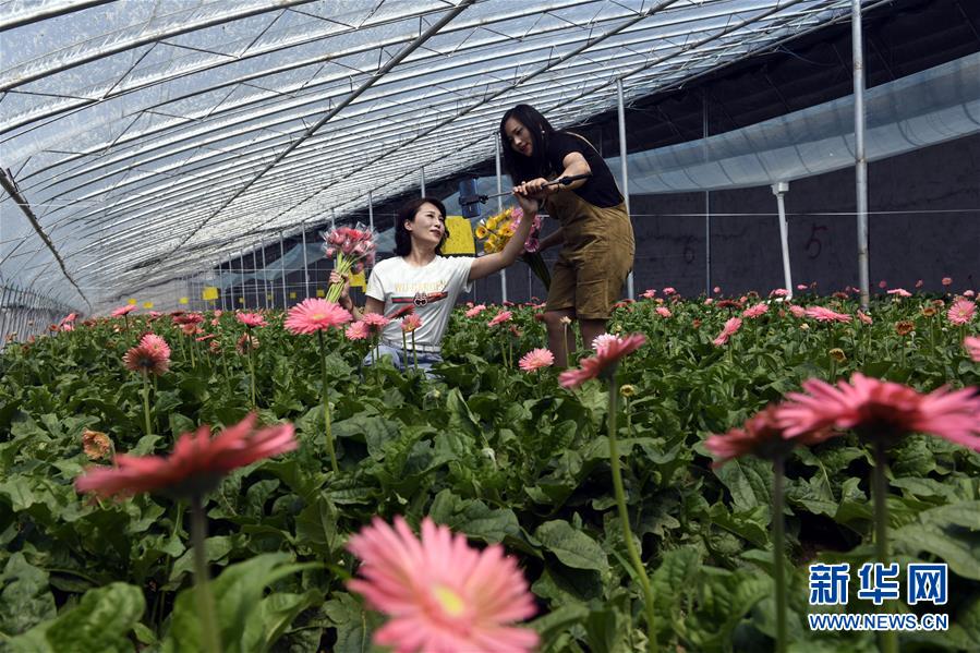 7月10日,在莒縣招賢鎮(zhèn)西黃埠村盛世花卉種植專業(yè)合作社,駐村第一書記鐘翠娟(左)在扶郎花種植大棚進行網(wǎng)上直播。山東省日照市莒縣招賢鎮(zhèn)有20余年的玫瑰花、扶郎花種植歷史。目前,招賢鎮(zhèn)投資建設的高標準特色鮮花種植大棚可年產(chǎn)700-800萬枝優(yōu)質(zhì)玫瑰和扶郎花等,帶動周邊鄉(xiāng)鎮(zhèn)的建檔立卡貧困戶脫貧增收。新華社記者 范長國 攝