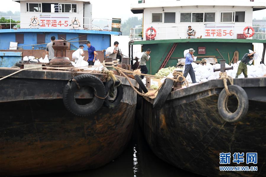 7月14日,當(dāng)?shù)卮迕裢簧习徇\(yùn)砂石袋。近日,受洪水影響,安徽省望江縣華陽鎮(zhèn)境內(nèi)的江調(diào)圩內(nèi)部道路漫水,搶險(xiǎn)車輛無法進(jìn)入。當(dāng)?shù)胤姥床块T組織船只裝載砂石袋等防汛物資,運(yùn)往圩堤保防汛。新華社記者 劉軍喜 攝