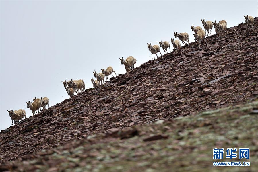 7月7日在可可西里卓乃湖區(qū)域拍攝的一群藏羚羊。目前正值藏羚羊產(chǎn)仔季。來自青海三江源、新疆阿爾金山、西藏羌塘等地的藏羚羊來到位于青海省可可西里腹地、被譽為“藏羚羊大產(chǎn)房”的卓乃湖區(qū)域產(chǎn)仔。新華社記者 張龍 攝