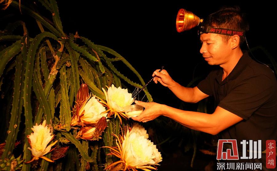 2020年7月14日晚,在廣西融水苗族自治縣融水鎮(zhèn)三合村黎鄧屯,兩名村民正在給紅心火龍果“點(diǎn)花”。