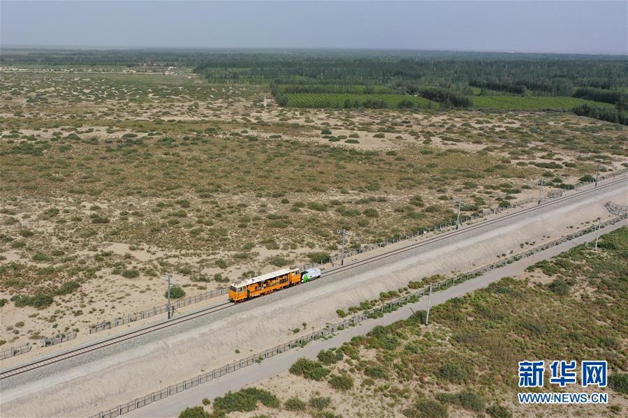 一列鋼軌打磨車行駛在工作區(qū)(7月14日攝,無人機照片)。新華社記者 丁磊 攝