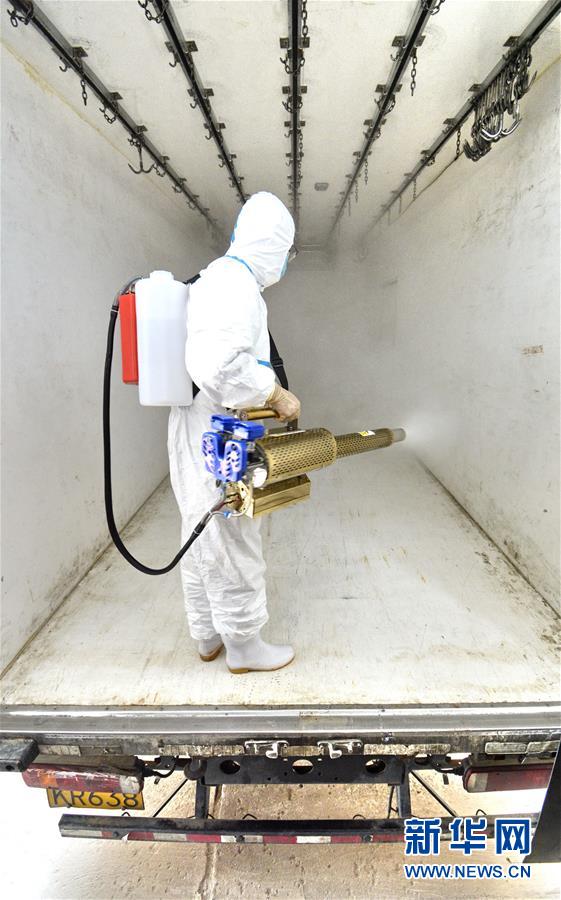 7月15日,北京二商肉類食品集團(tuán)有限公司員工對(duì)冷鏈運(yùn)輸設(shè)備進(jìn)行消毒。北京二商肉類食品集團(tuán)有限公司是保障北京肉類市場(chǎng)供應(yīng)的主要企業(yè)之一。新冠肺炎疫情以來,企業(yè)嚴(yán)格實(shí)施北京市、農(nóng)業(yè)農(nóng)村部和中國肉類協(xié)會(huì)的防疫要求,對(duì)進(jìn)入廠區(qū)的人員、車輛以及原料采購、屠宰分割、產(chǎn)品加工、貯藏運(yùn)輸、廢棄物收集及污水處理等生產(chǎn)環(huán)節(jié)嚴(yán)格防疫,強(qiáng)調(diào)源頭把關(guān)徹底消毒。目前,集團(tuán)公司下屬多家生豬屠宰加工基地正常運(yùn)營,保質(zhì)保量供應(yīng)北京市場(chǎng)需求。新華社記者 李欣 攝
