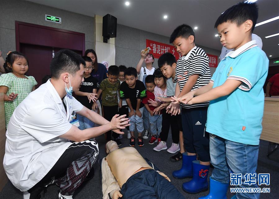 7月16日,東林鎮(zhèn)衛(wèi)生院的醫(yī)護(hù)人員(左一)在給學(xué)生們示范和講解心肺復(fù)蘇的操作知識(shí)。當(dāng)日,浙江省湖州市吳興區(qū)東林鎮(zhèn)舉辦暑期“安全防護(hù)小超人”主題活動(dòng)。活動(dòng)由醫(yī)護(hù)人員、消防隊(duì)員等為學(xué)生及家長(zhǎng)講授日常安全避險(xiǎn)及溺水急救知識(shí),中小學(xué)們還在現(xiàn)場(chǎng)學(xué)習(xí)了簡(jiǎn)易包扎、心肺復(fù)蘇的正確方式,并了解滅火器、滅火毯等消防器材的使用,為學(xué)生平安過暑期打好安全防護(hù)“預(yù)防針”。新華社記者 徐昱 攝