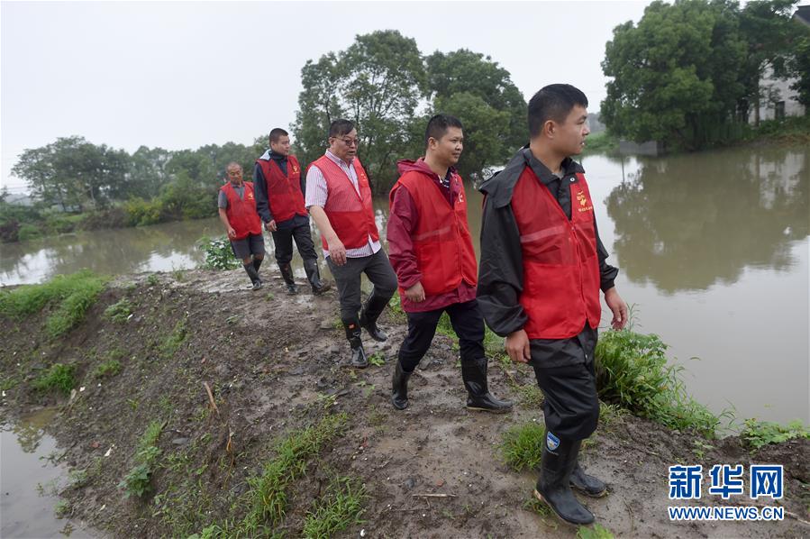 7月17日,基層網(wǎng)格員和志愿者在秀洲區(qū)新塍鎮(zhèn)小金港村的河道邊巡河。浙江省嘉興市秀洲區(qū)處在杭嘉湖平原,受持續(xù)強降雨及上游排水影響,近期,秀洲區(qū)境內(nèi)的京杭大運河分支航道持續(xù)保持較高水位。當?shù)叵嚓P(guān)部門嚴陣以待,落實各項措施,確保安全度汛。新華社記者韓傳號攝