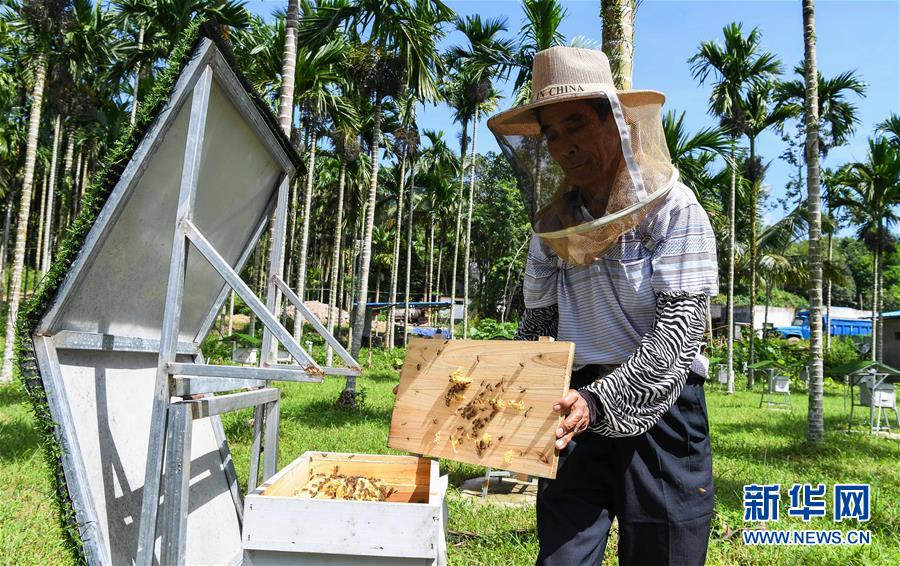 海南省瓊中黎族苗族自治縣長(zhǎng)征鎮(zhèn)一家智慧蜂場(chǎng)的工作人員在查看蜂箱(2018年8月22日攝)。新華社記者楊冠宇攝