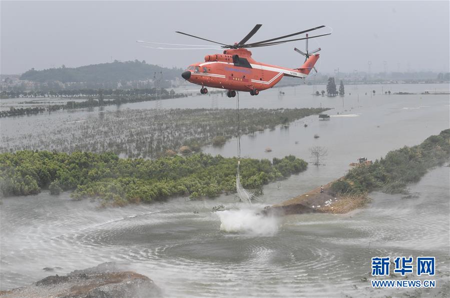 7月16日,湖北省應急管理廳緊急調(diào)度直升機,在湖北省陽新縣富河干堤葵賽湖下垸潰口上空,空投網(wǎng)兜石塊。新華社記者程敏攝