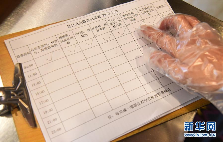 7月20日,濟(jì)南新世紀(jì)電影城陽(yáng)光100店的員工在展示消殺記錄。當(dāng)日,山東濟(jì)南市部分電影院在嚴(yán)格防控疫情的基礎(chǔ)上陸續(xù)恢復(fù)開放。新華社記者王凱攝