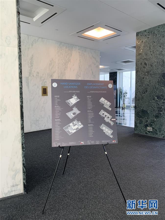 7月20日,在位于紐約的聯(lián)合國總部,秘書處大樓入口附近豎立著一塊標(biāo)明消毒液擺放點的指示牌。受新冠疫情影響而實行遠(yuǎn)程辦公4個多月的紐約聯(lián)合國總部20日進入重啟第一階段。按規(guī)定,該階段每天進入總部大樓人數(shù)不能超過400人。新華社記者王建剛攝