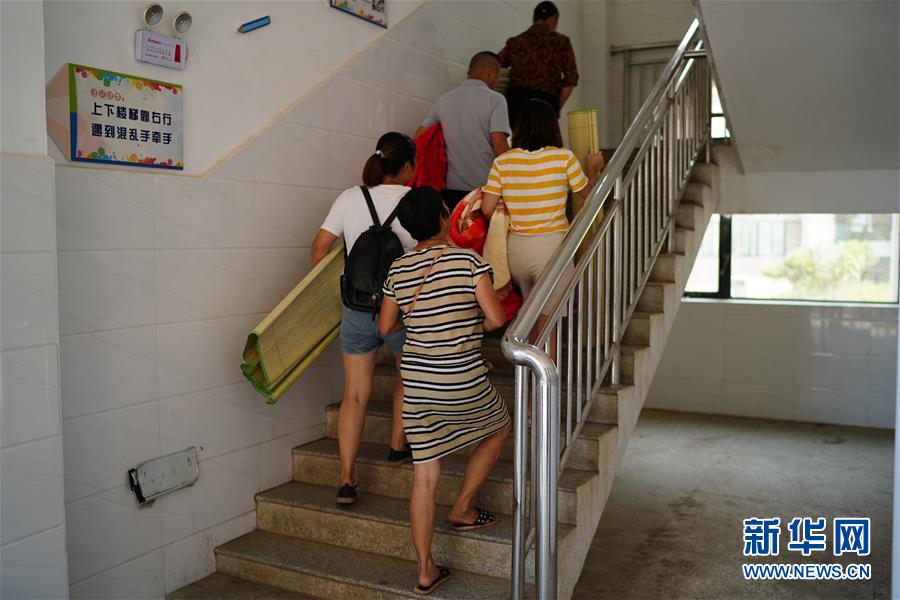 在江西永修縣湖東學(xué)校安置點(diǎn),群眾攜帶行李前往安置住處(7月13日攝)。新華社記者周密攝