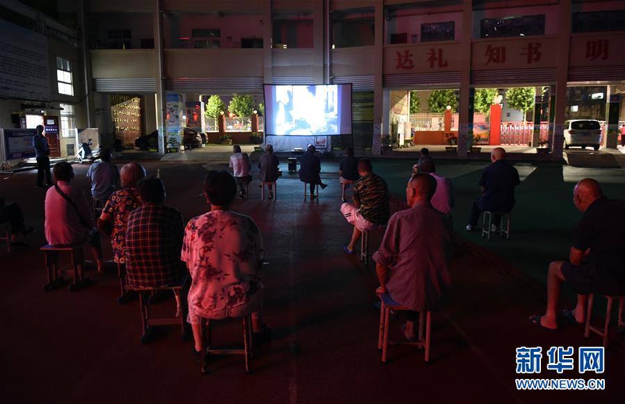 7月20日,轉移安置的群眾在安徽省安慶市迎江區(qū)華中路三小集中安置點看露天電影。新華社記者周牧攝