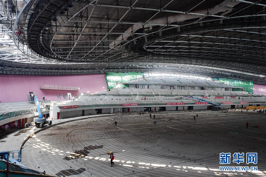 7月22日,工人在國家速滑館內(nèi)施工。新華社記者張晨霖攝