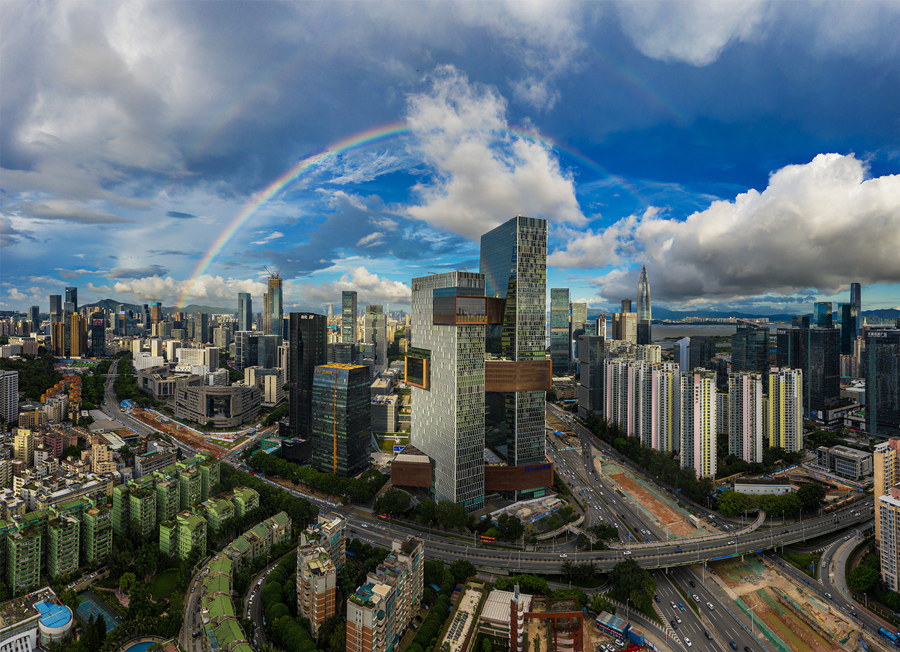 2019年8月29日傍晚,雨后的深圳灣出現雙彩虹,圖為騰訊濱海大廈上空的彩虹。