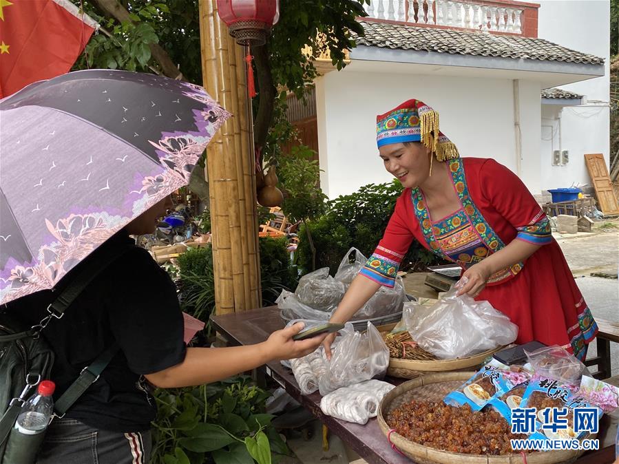 廣西恭城瑤族自治縣蓮花鎮(zhèn)紅巖村村民楊燕紅在家門口向客人推銷本地特產(chǎn)(7月16日攝)。新華社記者林凡詩(shī)攝