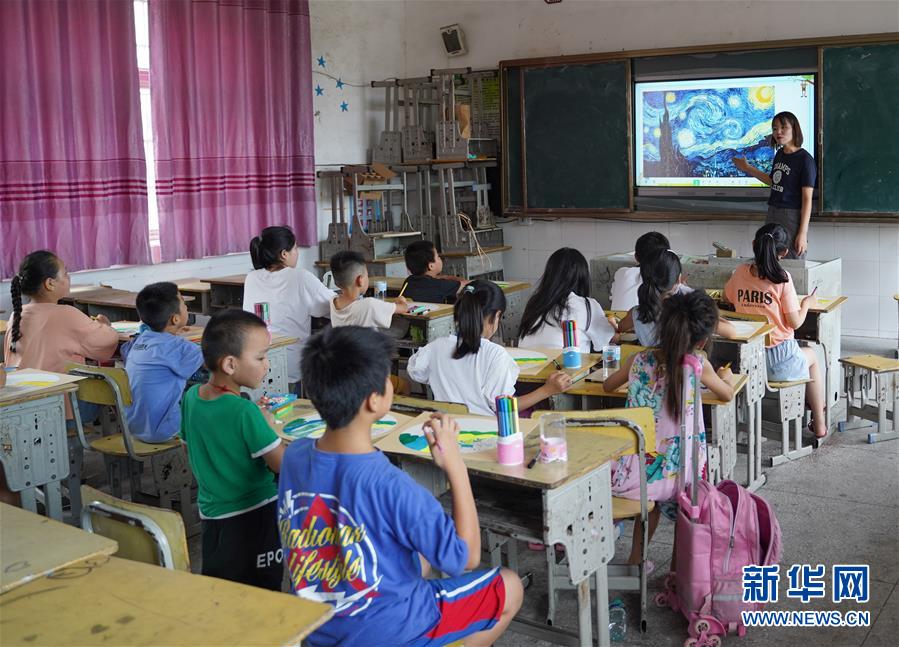 7月23日,在廬山市蛟塘鎮(zhèn)中心小學(xué)安置點(diǎn),老師給孩子們講解美術(shù)作品。新華社記者張浩波攝