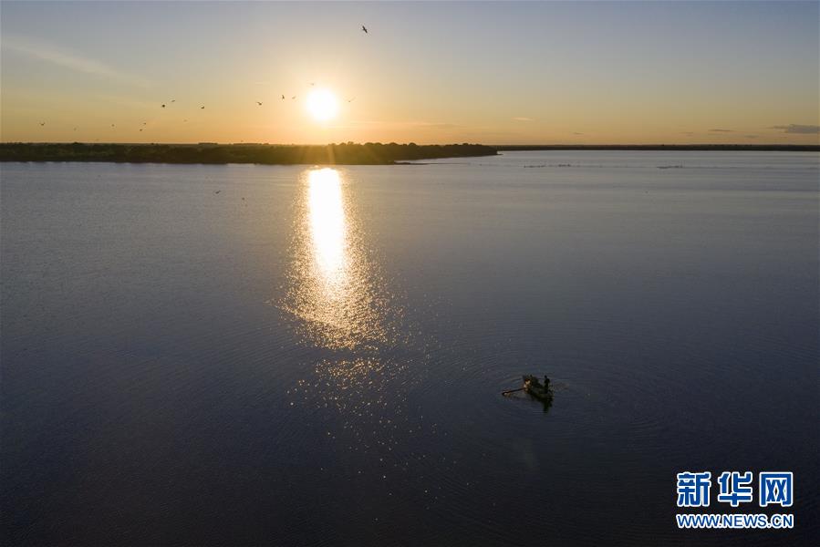 7月24日,漁民在大力加湖中捕魚(無人機照片)。大力加湖位于“中國東極”黑龍江省撫遠市,面積28.5平方公里,兩岸地勢低平,多濕地、草原,湖內水產豐富。夏日傍晚時分,漁民捕魚歸來,美麗畫卷映入眼簾。新華社記者謝劍飛攝