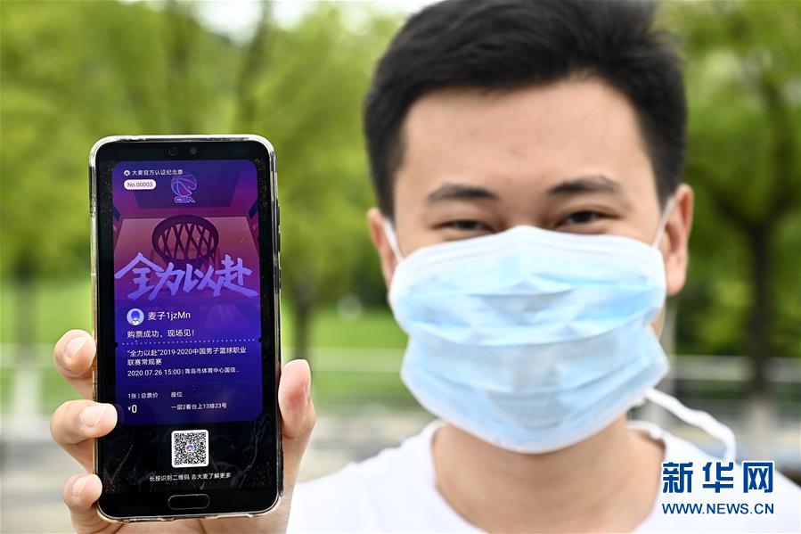 7月26日,在青島國信體育館,蘇柯帆展示自己的CBA電子票。他成為CBA聯(lián)賽復(fù)賽允許觀眾現(xiàn)場觀賽后,首位進(jìn)場的觀眾。當(dāng)日,在山東青島舉行的2019-2020賽季中國男子籃球職業(yè)聯(lián)賽(CBA)復(fù)賽第二階段(嶗山賽區(qū))比賽中,醫(yī)護(hù)人員、教師、公安戰(zhàn)線人士通過官方購票平臺(tái),完成包括核酸檢測在內(nèi)的相關(guān)流程后進(jìn)場觀看了上海久事隊(duì)迎戰(zhàn)山東西王隊(duì)的比賽。觀賽期間,觀賽者須全程佩戴口罩,對(duì)號(hào)入座,嚴(yán)格保持間隔一米就座。退場時(shí),觀眾須按照自后向前、先兩邊后中間的順序,保持“一米線”社交距離有序退場。新華社記者 郭緒雷 攝